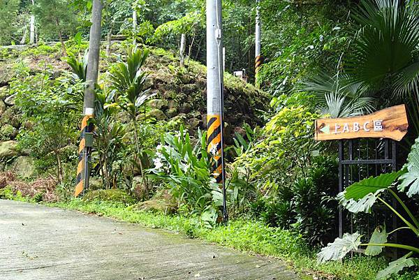 往上ABC區走。一旁還有往水泥地的小小路,應該不常通行。園區沒有草地的水泥石頭路也因為下雨的關係,而長滿青苔,行走時要特別小心,非常滑。