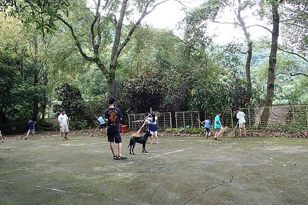 派出所有的小朋友幫忙掃地,應該很久沒使用了,地面上都是青苔。