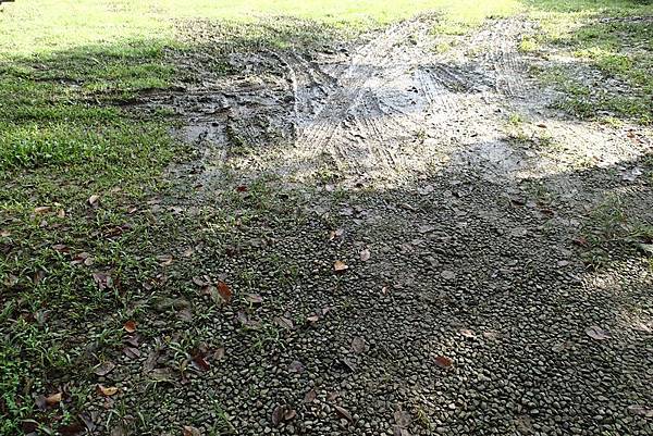 中央D的入口處也是有著深深的輪胎印。連續幾週的午後雷陣雨,讓土地的含水量飽和了。