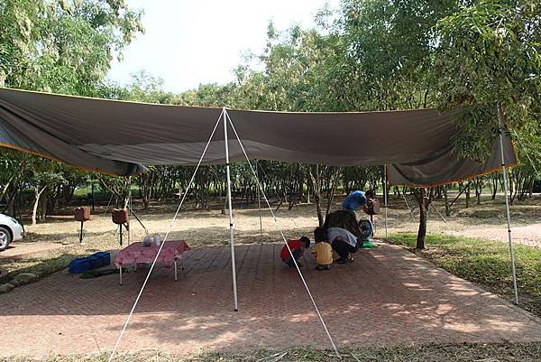 最後選定這個位置,先搭個天幕比較涼,順便告知這裡有人選了,因為還要外出吃午餐。荷蘭村是先到先選位,一格汽車營位是800元,不過場地租用需付保證金600元,退場前工作人員會來看場地,是否恢復完整,才可退還保證金。因為有詢問過當天只有5組預約,所以我們先將車子停旁邊,以利稍候的外出。