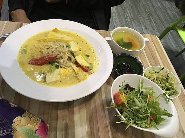 最後到的老公,點了豆漿鍋,那豆香味實在是太濃了,鮮蔬更是錦上添花,喜願的麵條好好吃喔!